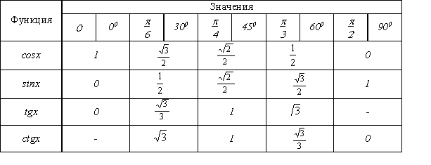 Основные значения тригонометрических функций углов I четверти приведены в таблице.